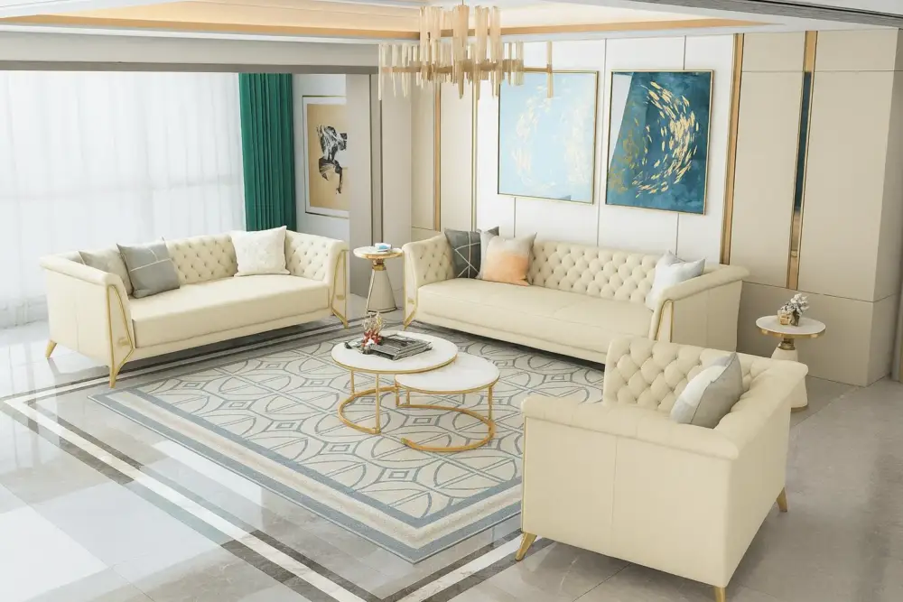 مصنوع هذا الطقم من مواد عالية الجودة لضمان الاستدامة والراحة الفائقة. يتميز هيكله بالخشب الهندسي وخشب الزان الروماني، مما يمنحه المتانة والقوة. وتأتي مغطاة بالجلد الإيطالي الفاخر لمظهر ينبض بالأناقة والفخامة. ولضمان الراحة القصوى، تم تبطينه بالإسفنج عالي الكثافة، مما يوفر دعمًا مثاليًا للجسم. وتزيد أرجله المعدنية الصلبة من استقراره وتحسين مظهره بشكل عام.
