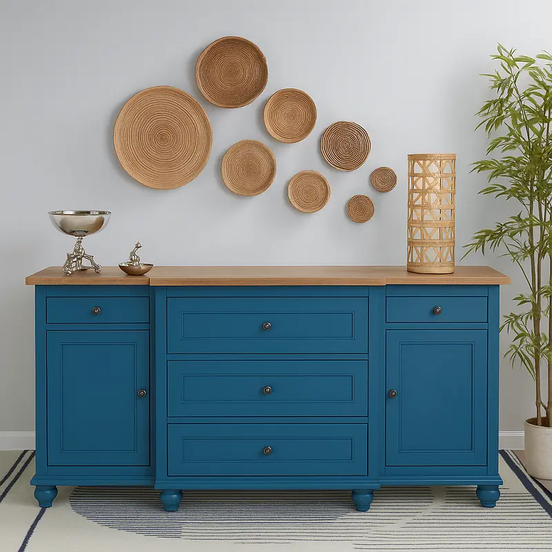 صُنعت هذه القطعة الرائعة بإطار من خشب هندسي وخشب زان روماني عالي الجودة ، مع قوائم منحوتة بعناية تضيف لمسة فنية إلى ديكور منزلك. يأتي البوفية بتشطيب فاخر من الفينير، الذي يضفي لمعانًا إضافيًا ويحمي الخشب من التآكل. تحتوي القطعة على خمسة أدراج وخزانتين، مما يوفر لك مساحة وفيرة لتخزين أواني المائدة بترتيب مثالي.