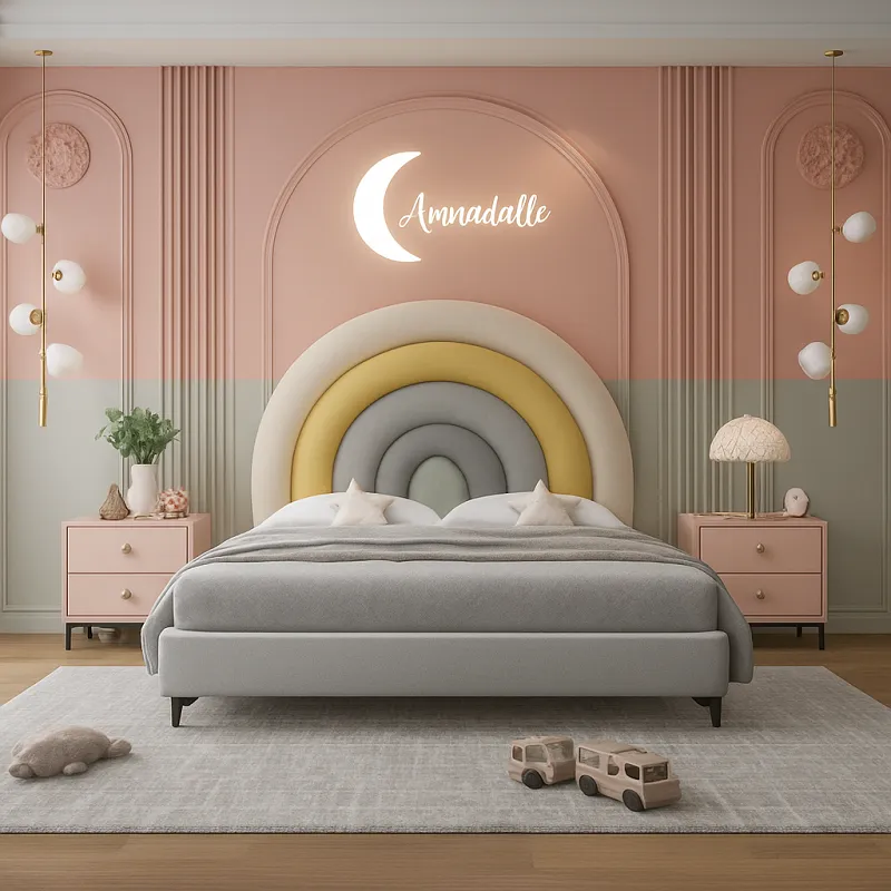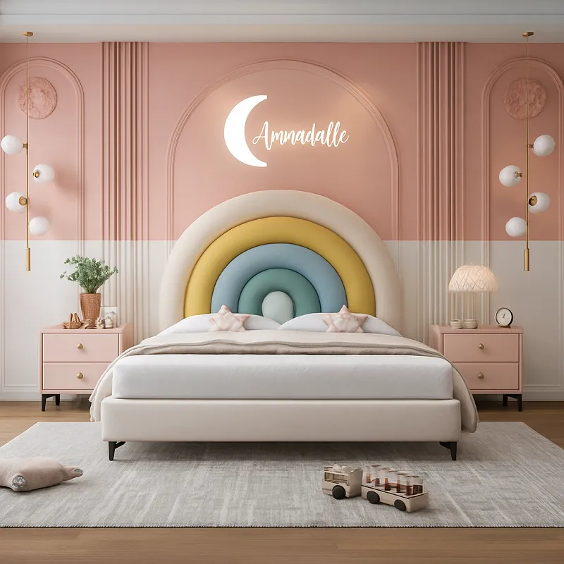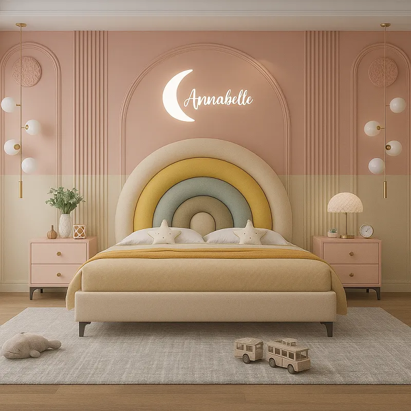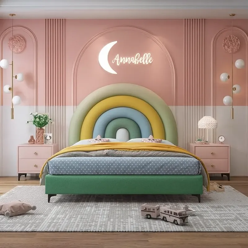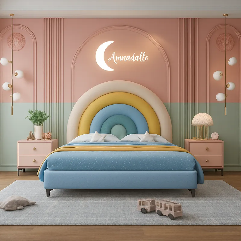 يتميز السرير بظهر فريد من قوس القزح، مما يعزز جوانب الديكور الحديث. يحتوي السرير على سحارة داخلية للتخزين، مما يوفر حلاً عمليًا لتنظيم أغراض الطفل.