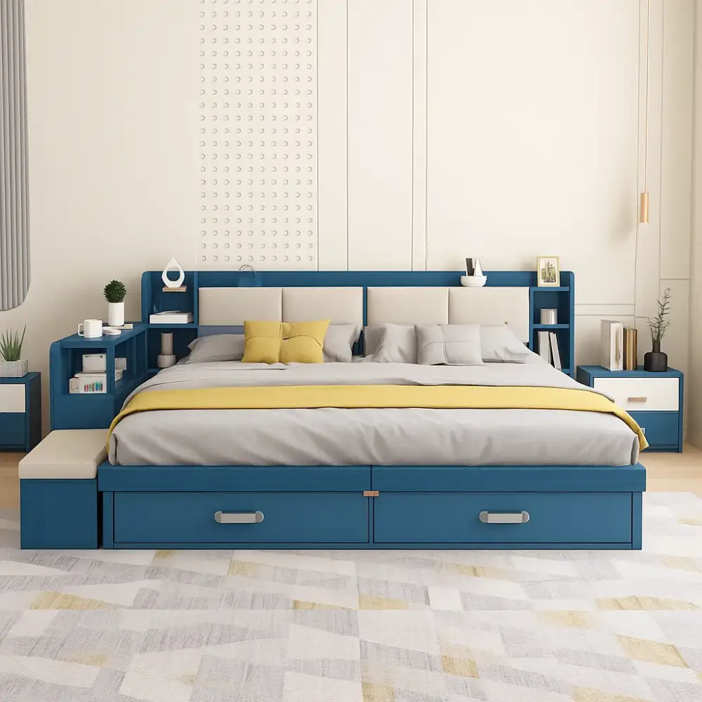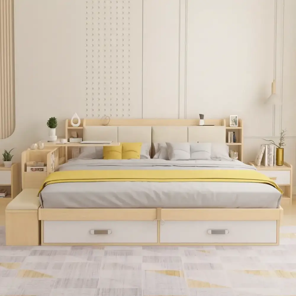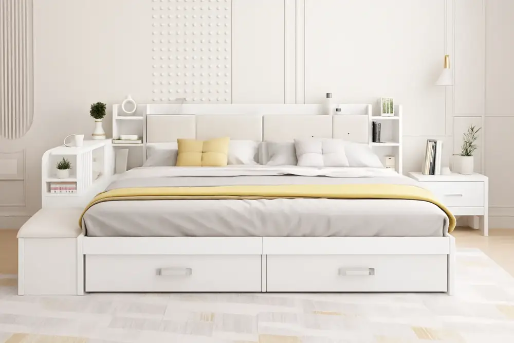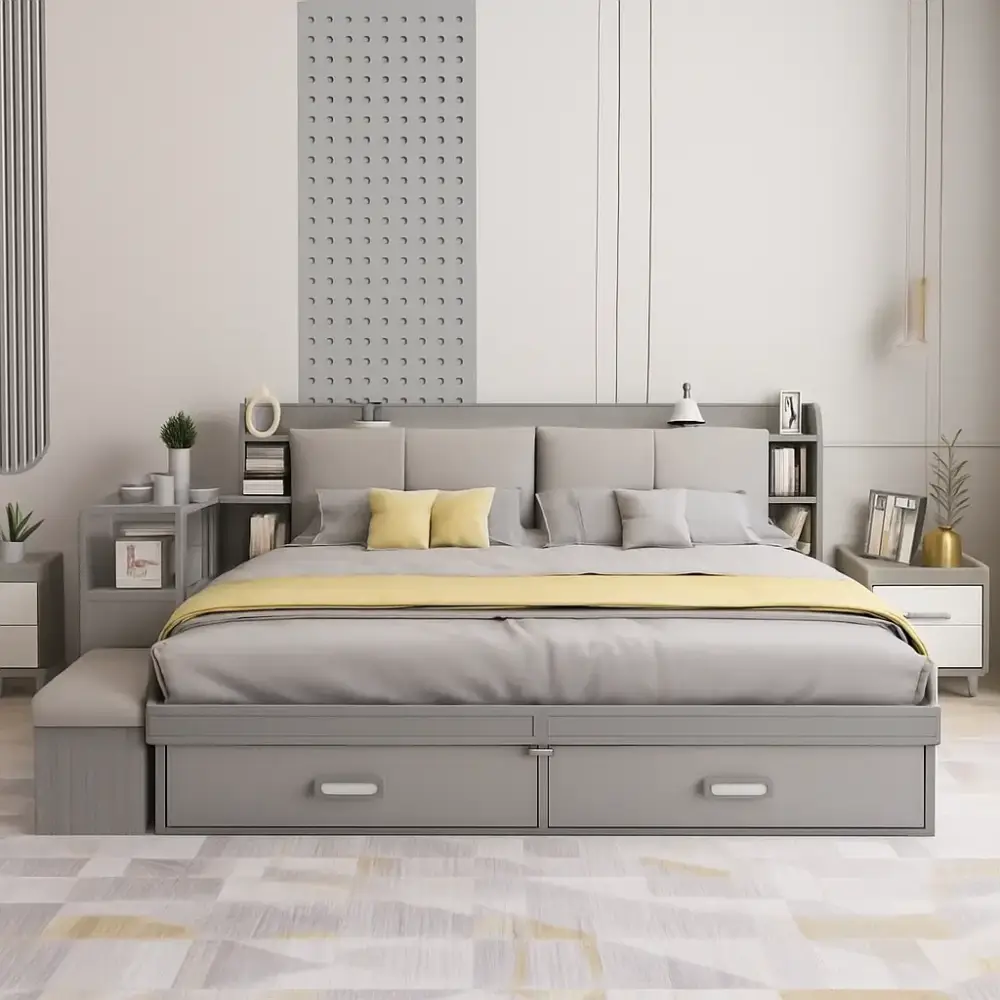 اقتني سرير بوحدات داخلية وجانبية من متجر اركان القصر المميز لإضفاء لمسة راقية ومميزة لمنزلك. يتميز السرير بتصميم أنيق وعصري يمكن تنظيفه بسهولة بمسحة رقيقة فقط عند الحاجة.