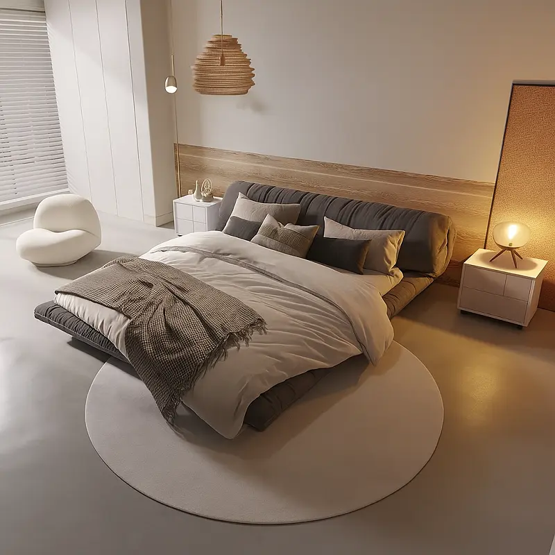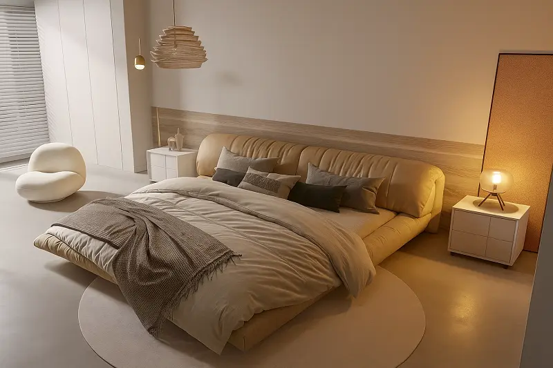 سرير غرفة نوم مع كمودينة بتصميم مميز