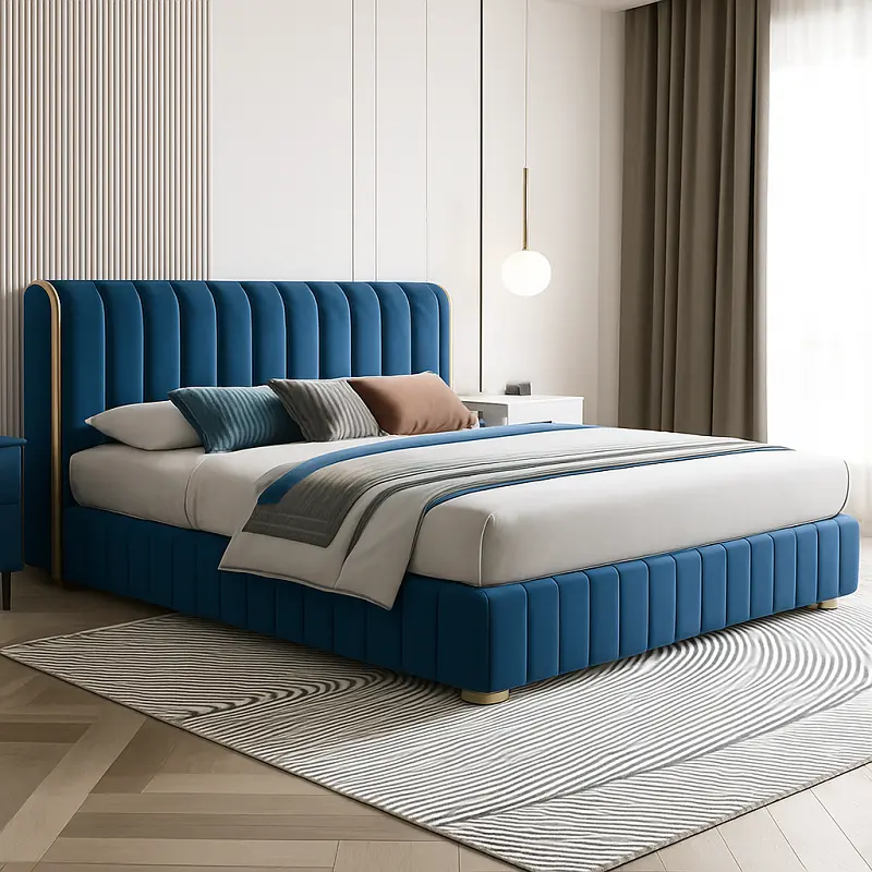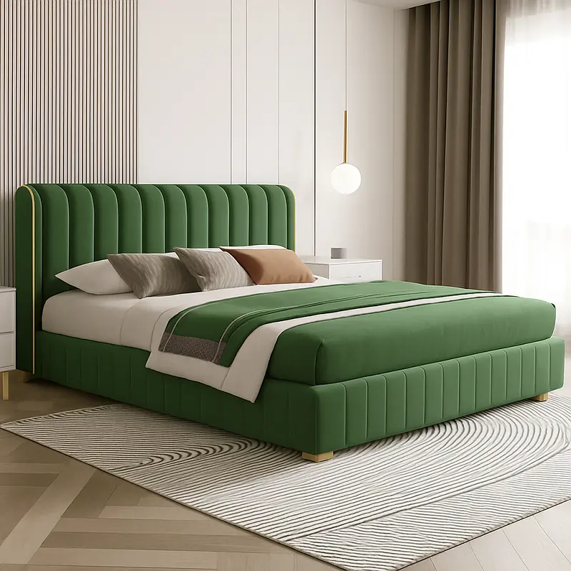 يمتاز السرير بظهر مرتفع منجد بالكامل، مما يوفر دعمًا مثاليًا للجلوس والقراءة. كما أن التفاصيل الانسيابية في التصميم تضيف لمسة ناعمة تعكس الأناقة العصرية مع طابع كلاسيكي يناسب الذوق الخليجي. قاعدة السرير مصممة لتمنحك الثبات الكامل دون إزعاج أثناء النوم.