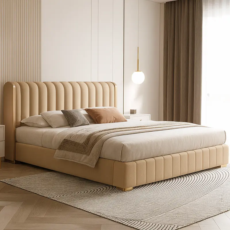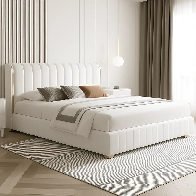 صُنع السرير من خشب زان متين عالي الجودة، ما يمنحه بنية صلبة وقوة تحمل ممتازة. الإطار الداخلي مغطى بتنجيد فاخر من جلد ناعم الملمس، يمنح مظهرًا راقيًا وسطحًا مريحًا للاتكاء، مع إسفنج عالي الكثافة يضفي طابعًا مريحًا وأنيقًا في آنٍ واحد.